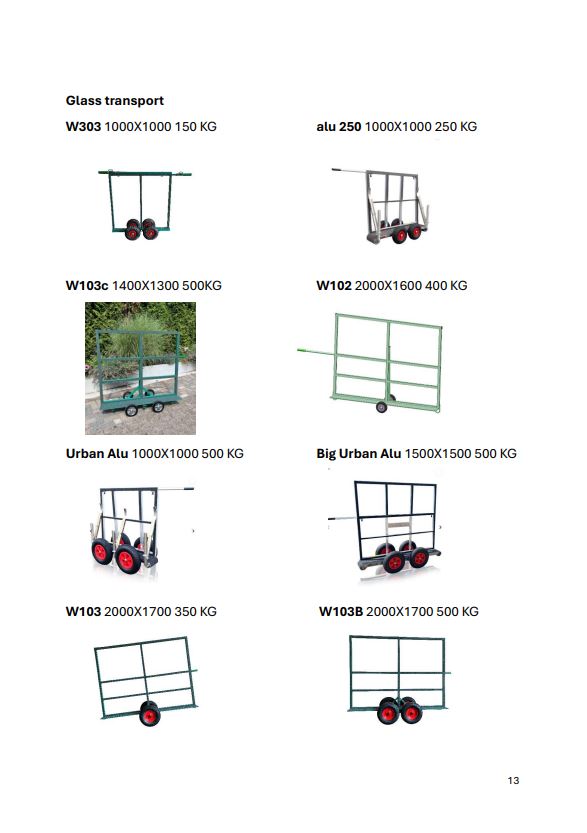 NL: deze aluminium wagen is licht gewicht, geschikt voor 250 kg en heeft een brede laadplank van 18 cm. Deze wagen is speciaal ontwikkeld voor het transport van kozijnen, matrassen, Grote flatscreen schermen, er zijn teven beugels te krijgen om los glas vast te klemmen of beugels om bv lange lengtes glaslatten of een zonnenscherm te vervoeren.