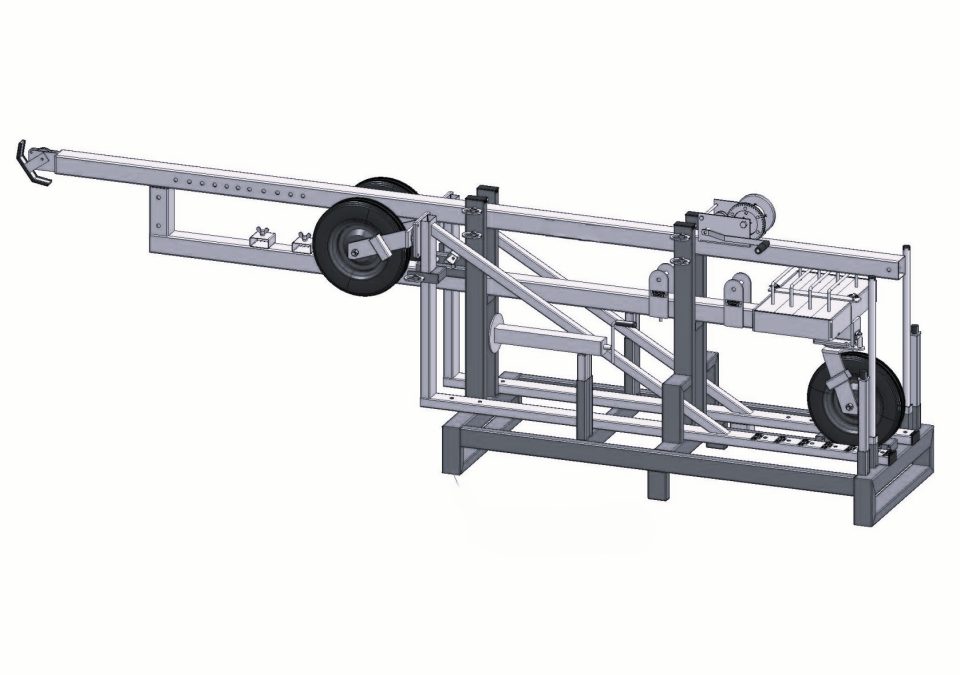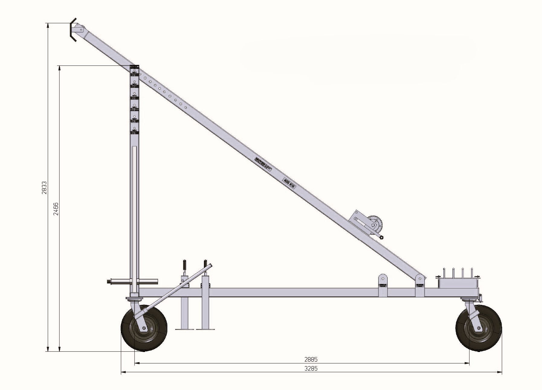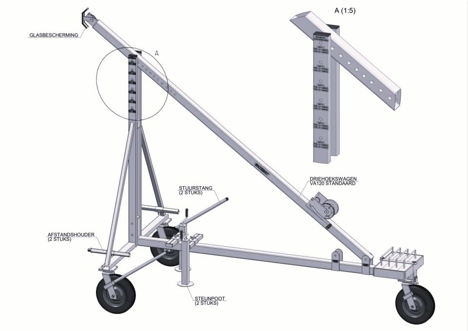 This car is mobile on 3 big air tires, with 100 kg countra weight, length about 3 m, height about 2.8 meters. The car can easily be disassembled, complete with winch. Only suitable for use on the ground floor, perfect to use for the handling of shop windows, always use the correct vacuum machine.