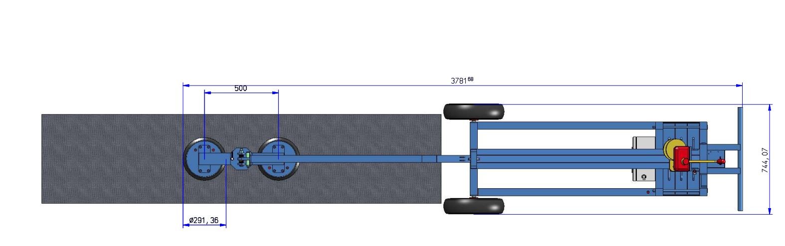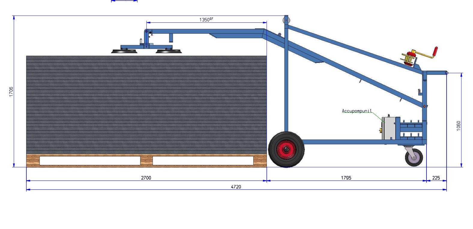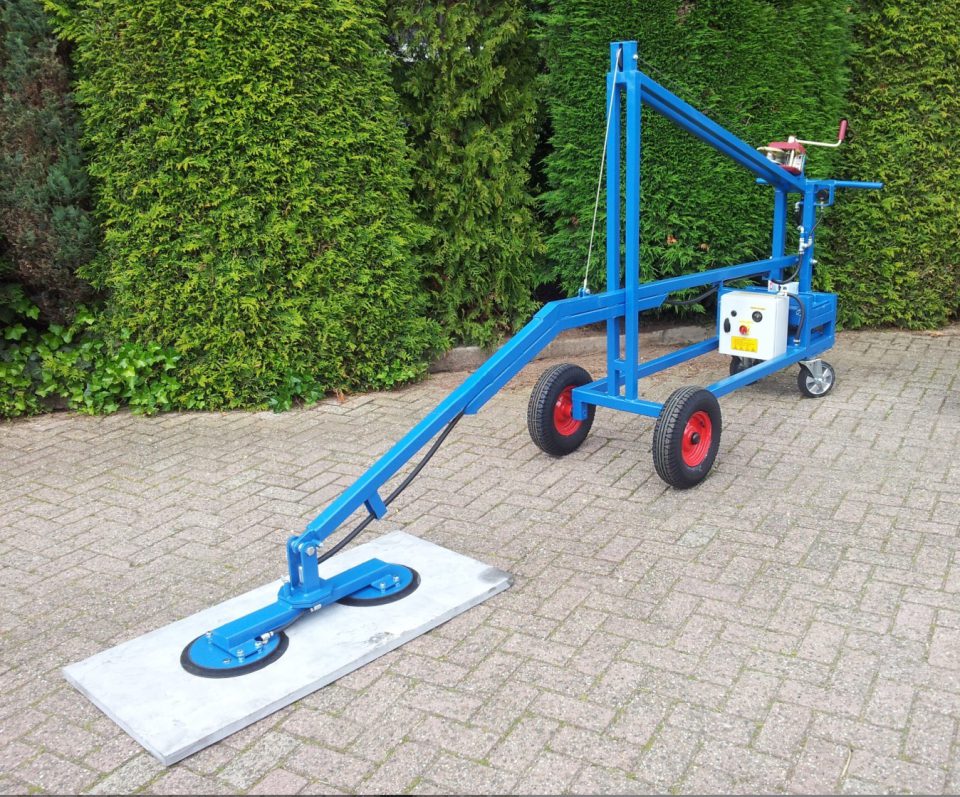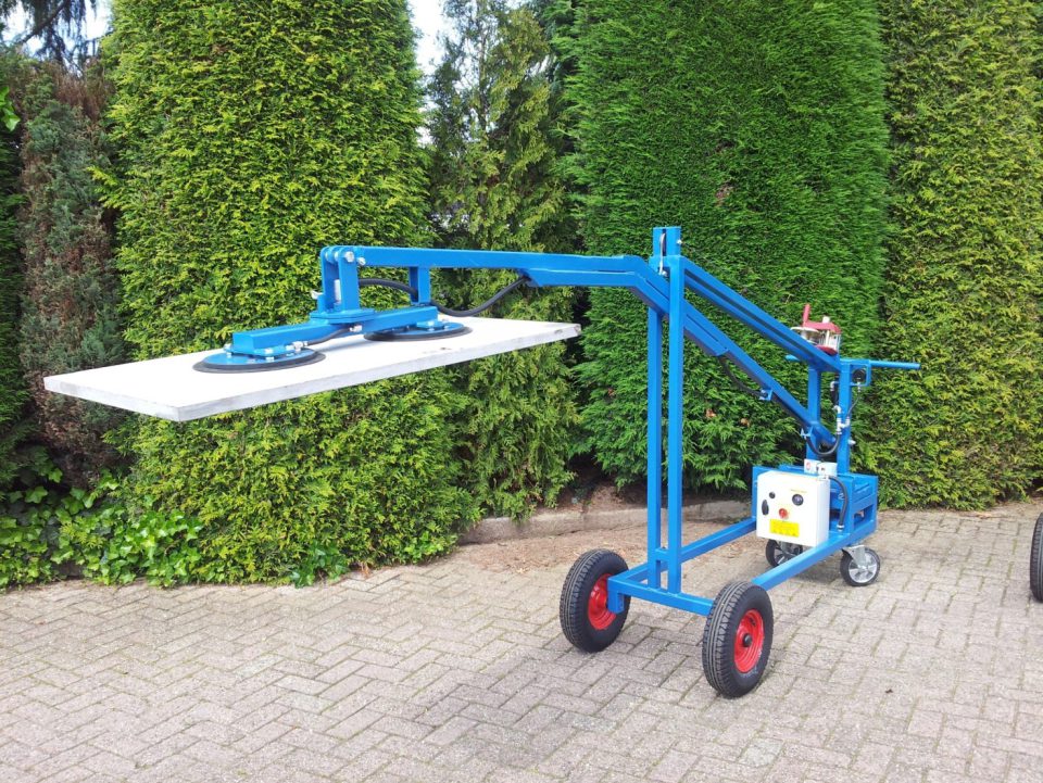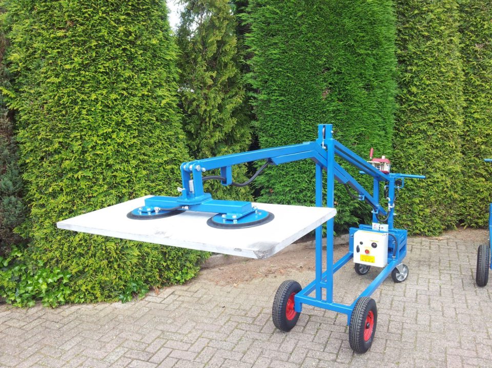 This machine is special made for installation of computer floor and installing bigger floor panels. Complete on battery with manual winch and contra weight, on air wheels 150 kg max. The pad can be changed from position.