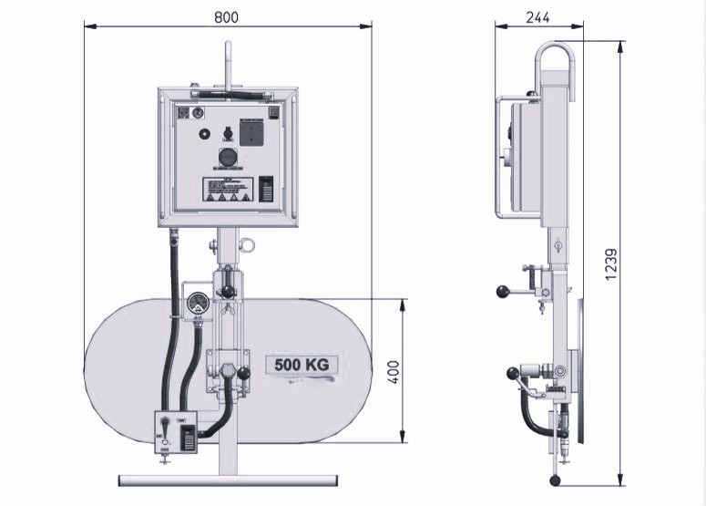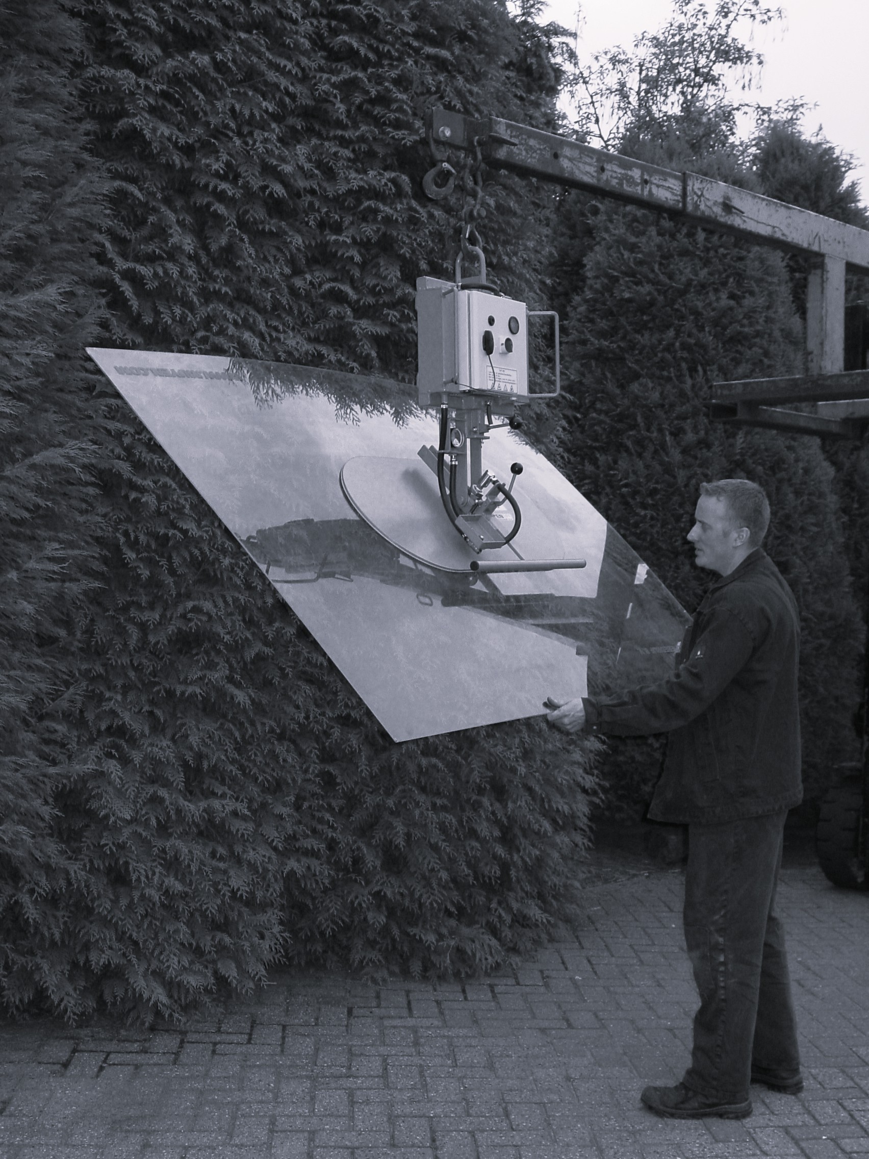 In 500 kg 80×40 cm or 750 kg 100×60 cm. The oval pad can turn and tilt, suitable for glass, concrete, sandwichpanels etc. You make a choise for a High or low model batterybox. High model you use for glass and sandwichpanels. You use the low model in situations where you need to save lifting height, for example under awnings, roofs, balconies or when piercing a window frame.