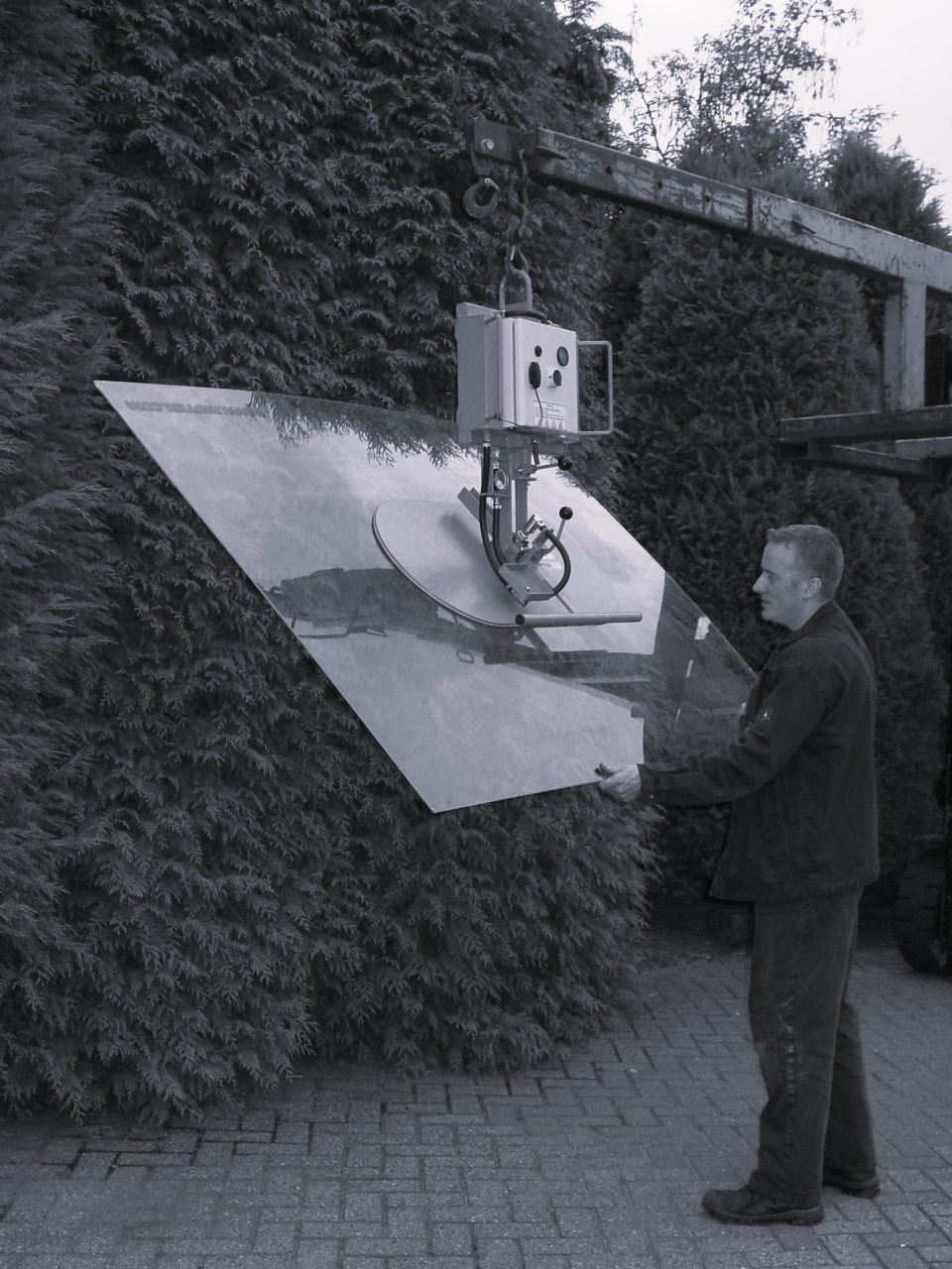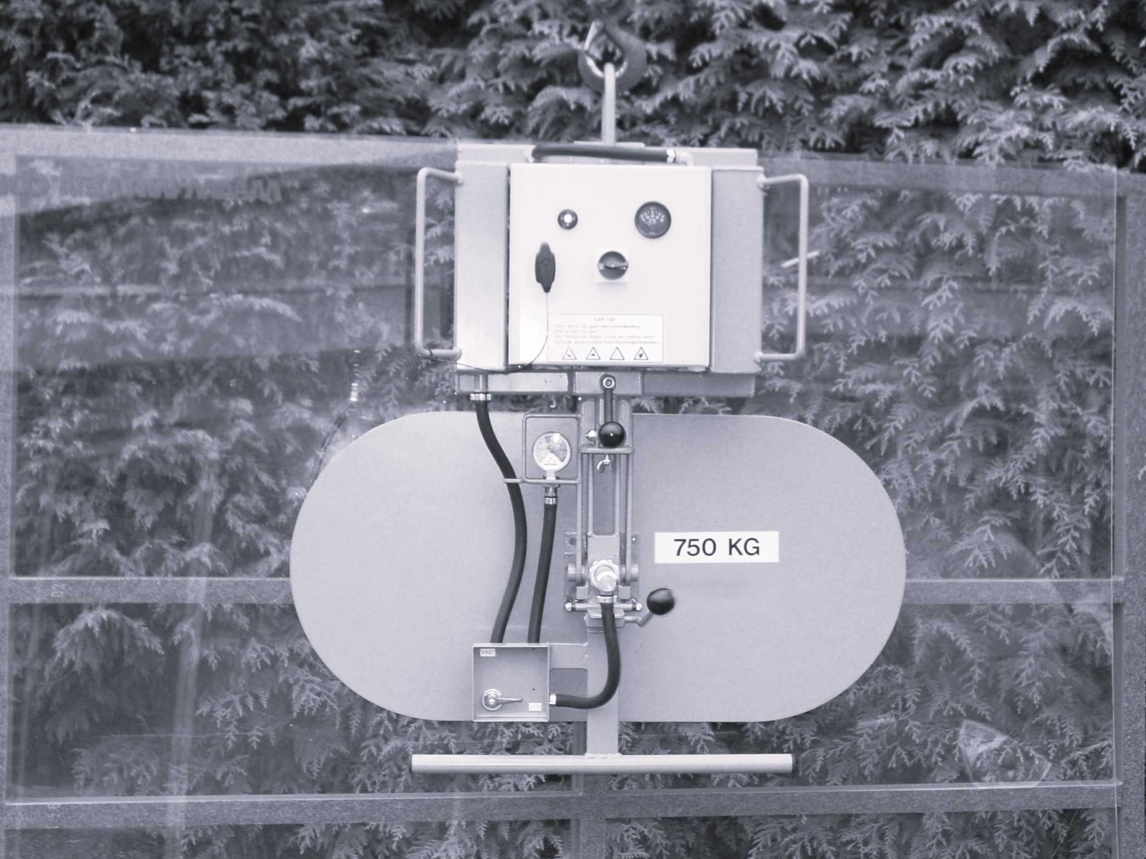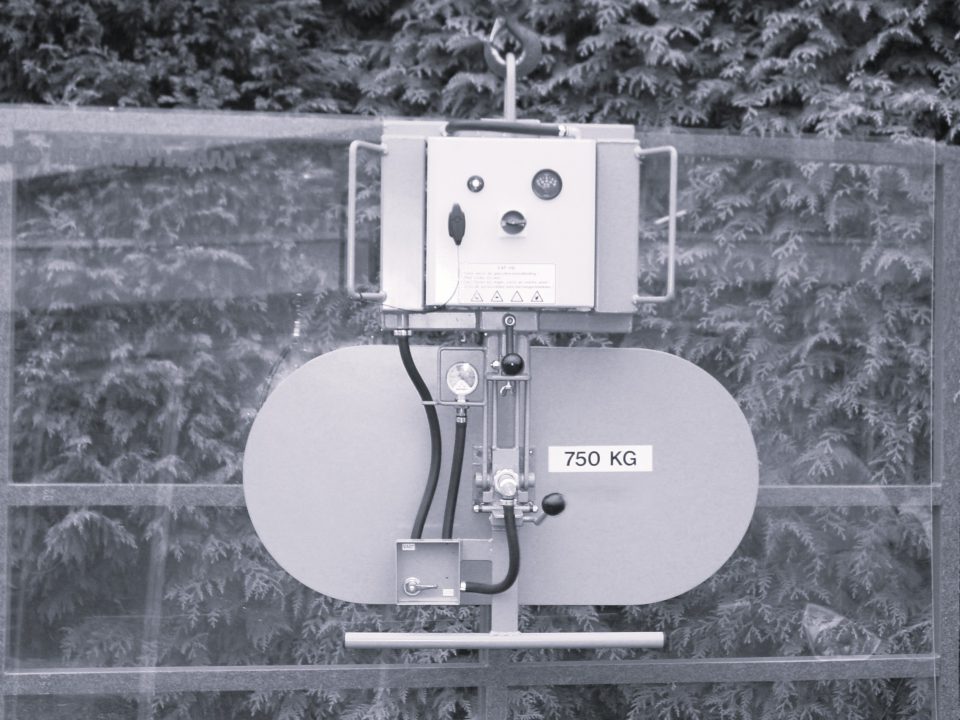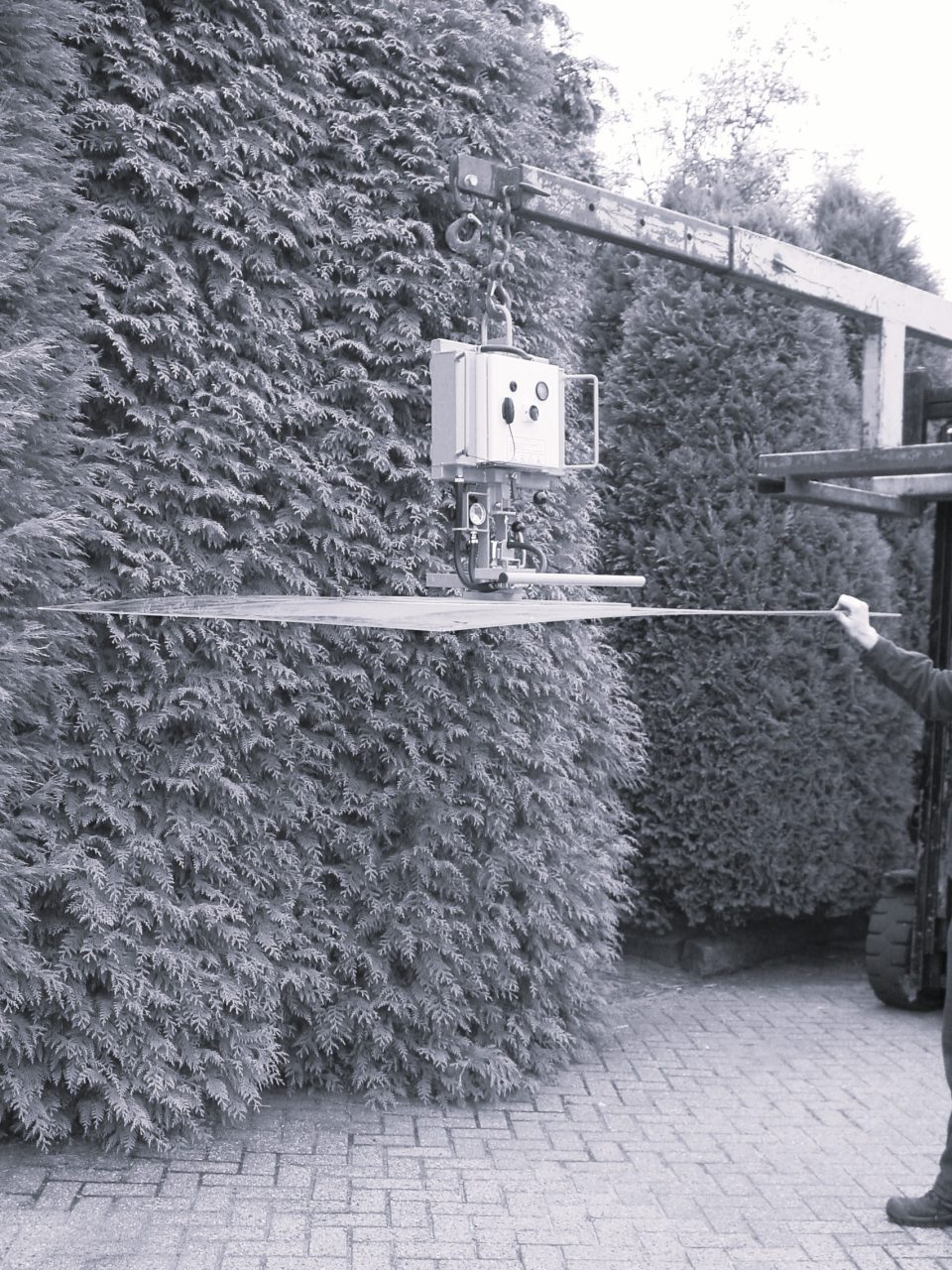 A vacuum lifter low model 500 or 750 kg, turn 360 degrees and tilt horizontal to vertical position. When you work with sandwich panels you choose the heigh model with the batterybox on top.