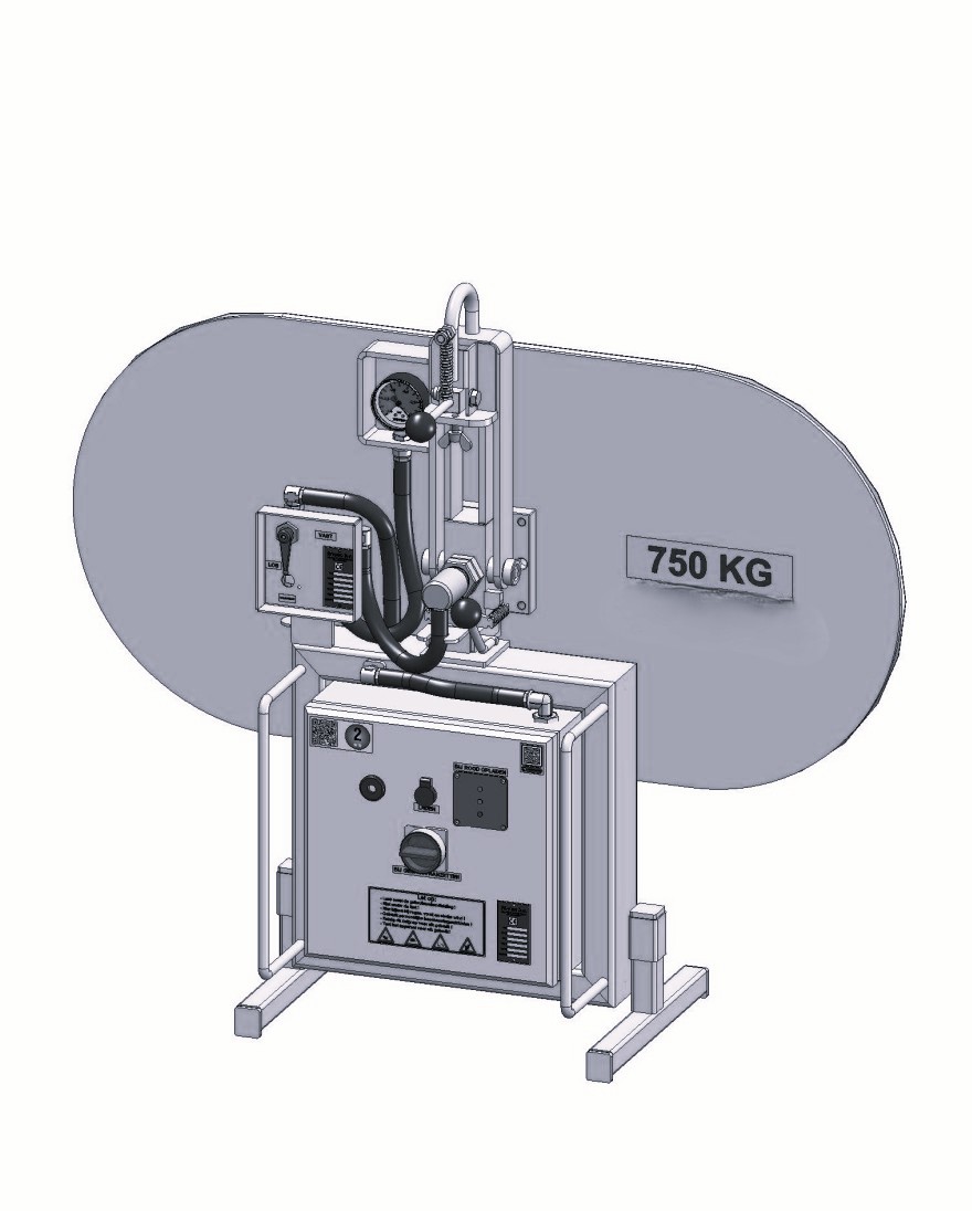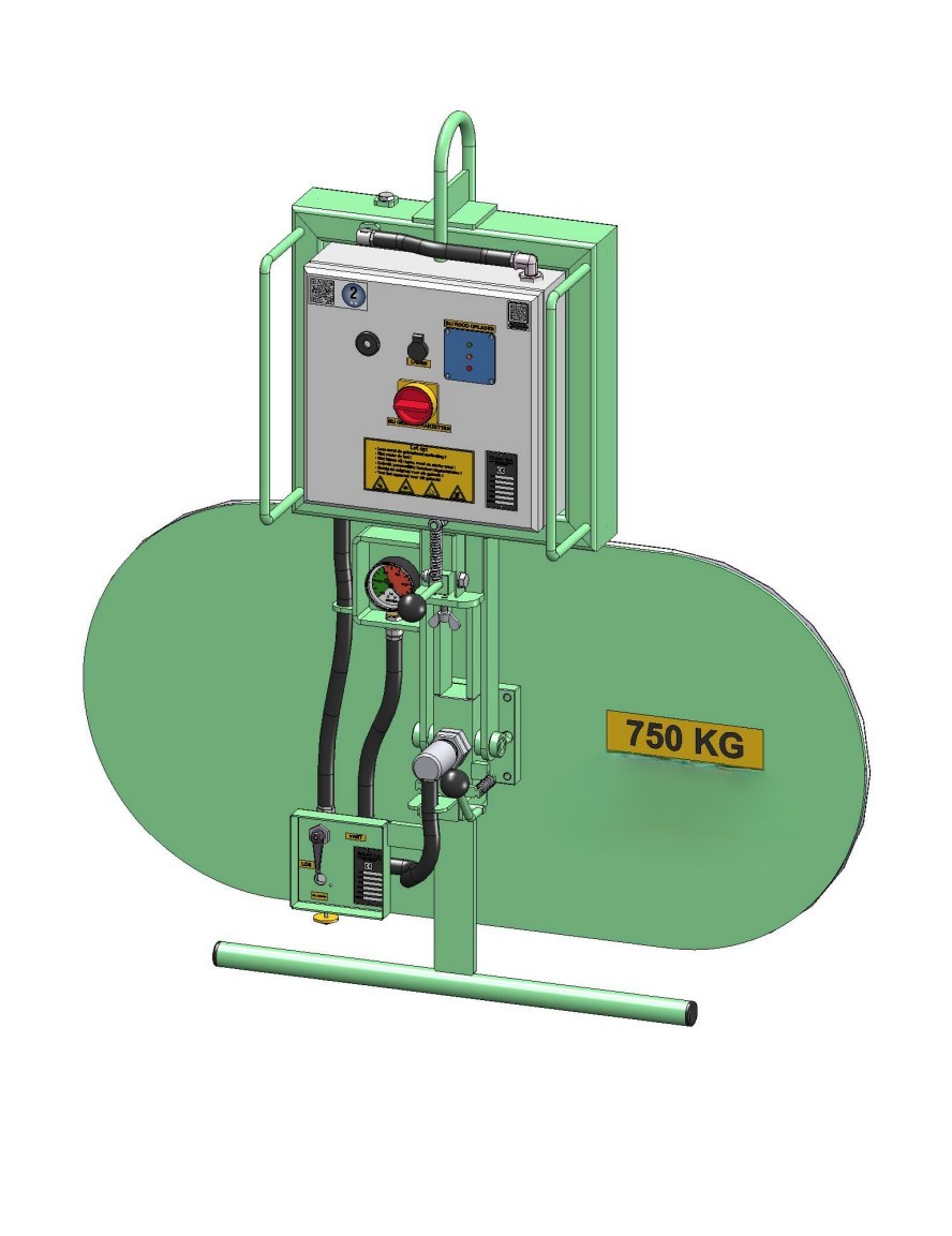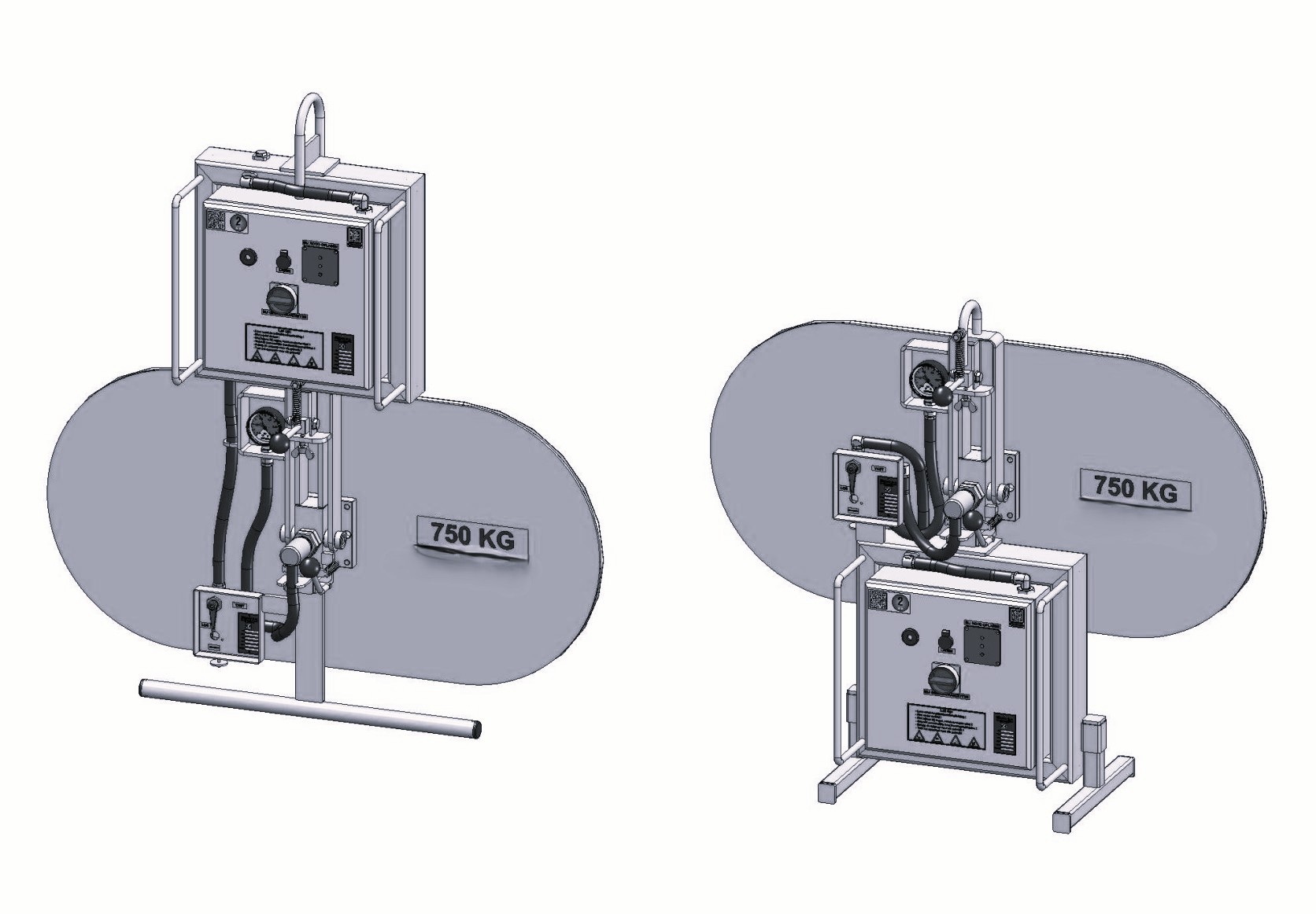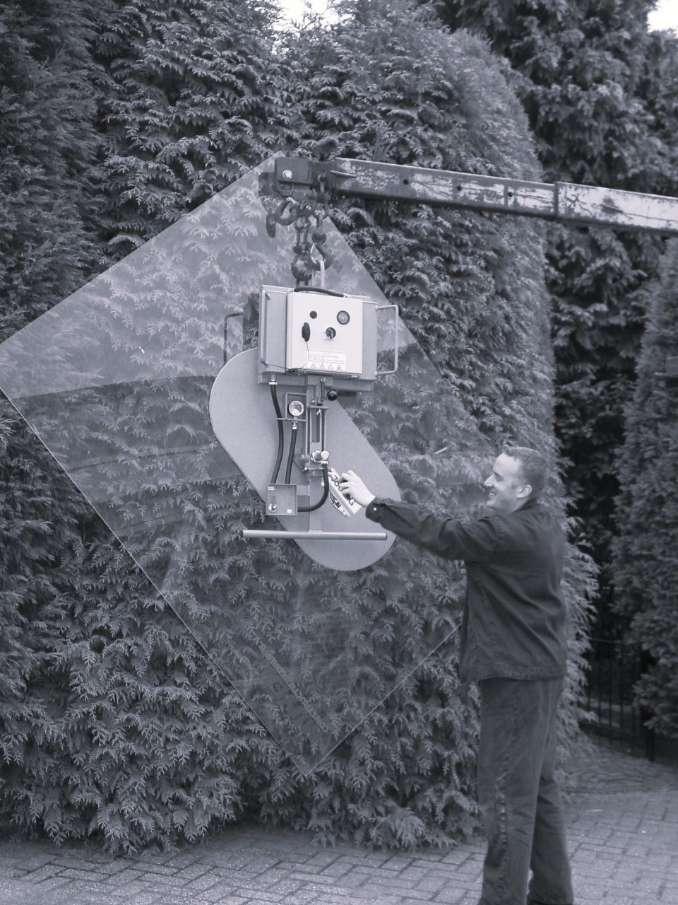 A vacuum lifter low model 500 or 750 kg, turn 360 degrees and tilt horizontal to vertical position. When you work with sandwich panels you choose the heigh model with the batterybox on top.